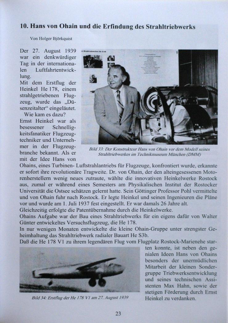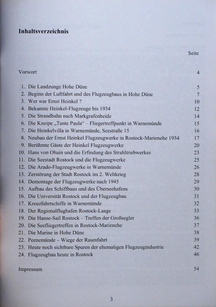 In dieser Broschüre wird in mehreren Kurzgeschichten die Entwicklung der Luftfahrt und der Flugzeugindustrie in Rostock beschrieben. Von den Anfängen mit dem Bau eines Wasserflugplatzes in Warnemünde, der Ansiedlung und dem Wachstum der großen Flugzeugwerke Heinkel und Arado. Die wichtigsten und bekannten Flugzeugtypen aus dieser Zeit werden vorgestellt. Auch die Auswirkungen auf die städtebauliche Entwicklung der Seestadt Rostock, die Zerstörung der Stadt während des Krieges und die Demontage in der Nachkriegszeit. Die daran anschließende Zeit des Wiederaufbaus und der Herausbildung neuer Industriezweige bis hin zu neuen Initiativen des Flugzeugbaus in der Gegenwart. Auch die heute noch sichtbaren Spuren der ehemaligen Flugzeugindustrie werden, mit vielen Bildern illustriert, dem interessierten Leser vorgestellt.